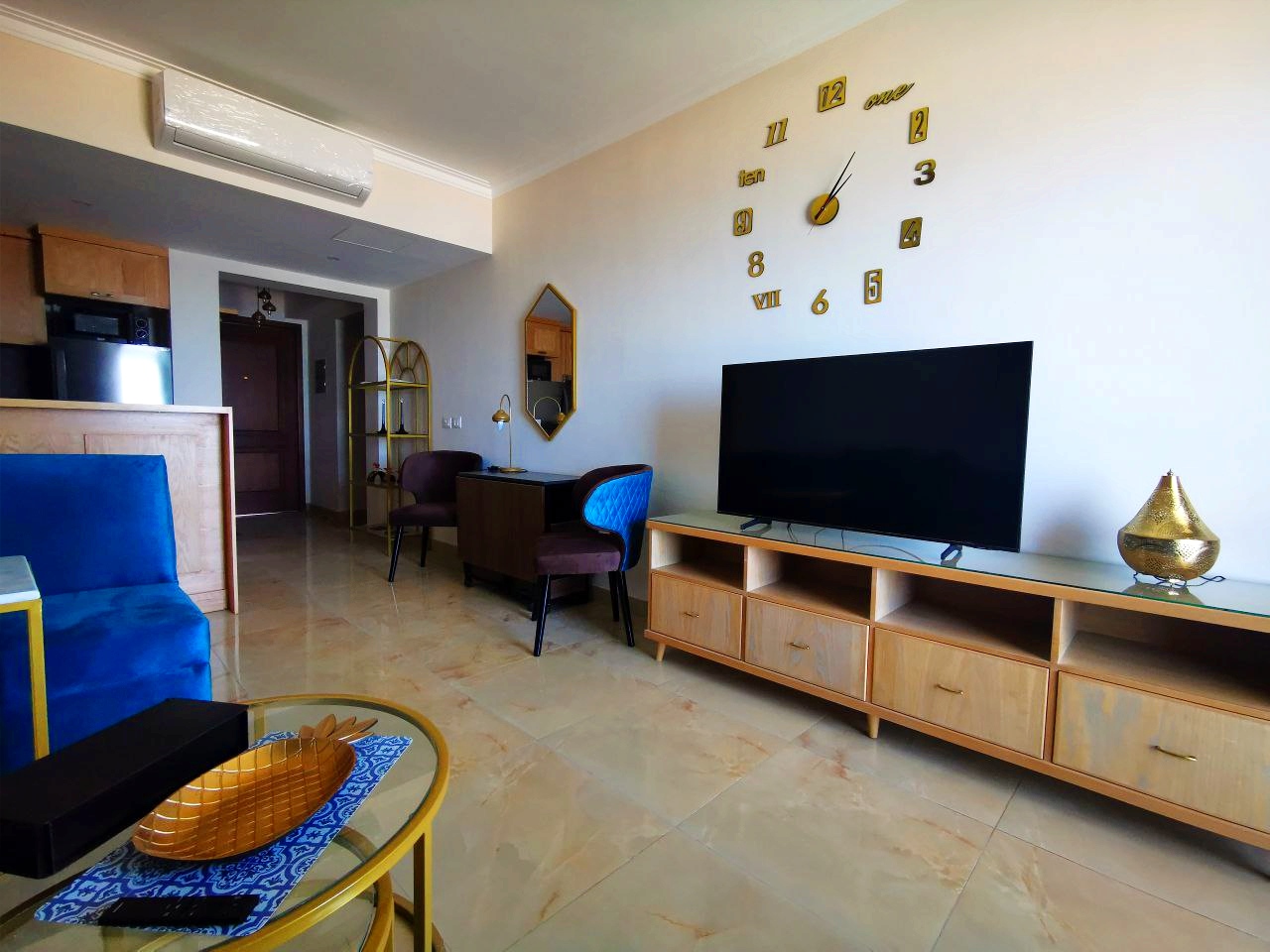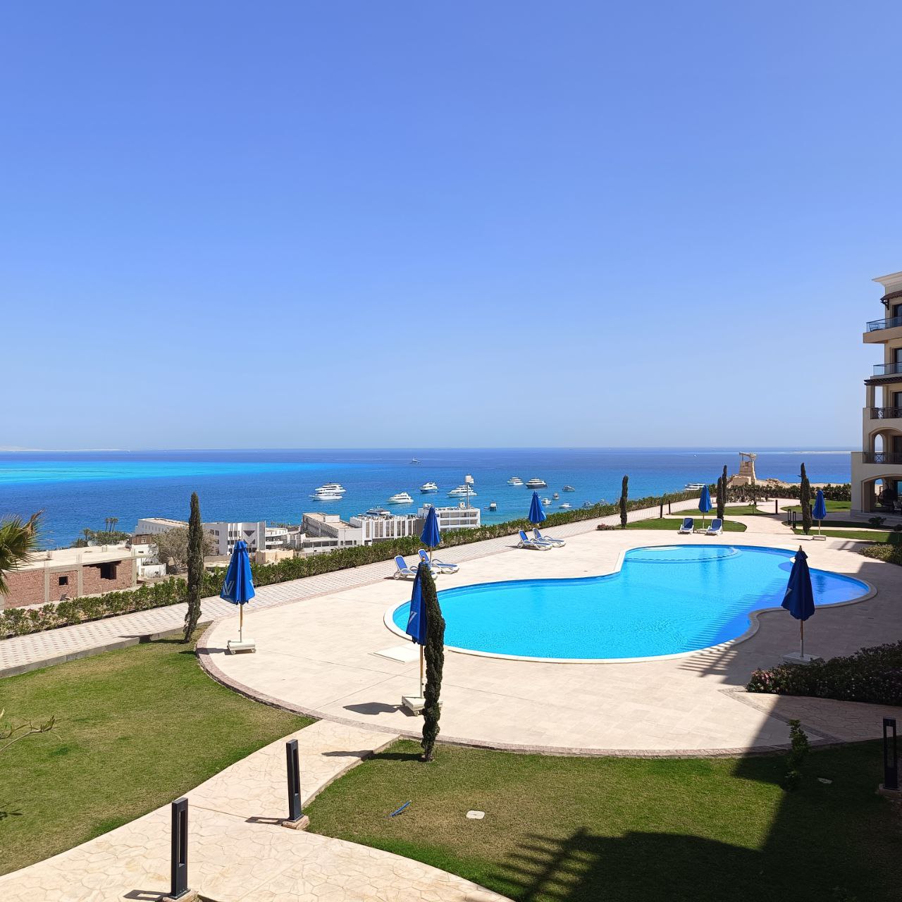 KIndulge in luxury living with this modern one-bedroom flat in Hurghada, offering a panoramic sea view of the Red Sea. Relax in the bright living area with floor-to-ceiling windows, wake up to the soothing sea view from the cozy bedroom, and enjoy meals in the well-appointed kitchen with a stunning backdrop. The private balcony provides the perfect spot to soak in the sun and watch the sunset over the sea. Located in a prestigious complex with amenities like a swimming pool and fitness center, this flat is your gateway to the vibrant coastal city of Hurghada with its beaches, nightlife, and diving spots. Don’t miss the chance to make this flat your oasis by the sea.
